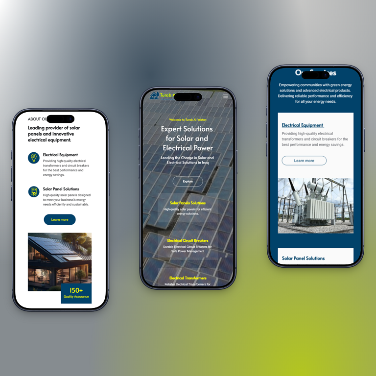 The Turab Al-Watan website balances innovation with clarity. With a clean visual hierarchy, engaging imagery, and professional typography, the site communicates both technical strength and corporate credibility. The color palette and layout evoke energy, precision, and trust — perfectly matching the solar industry’s identity.